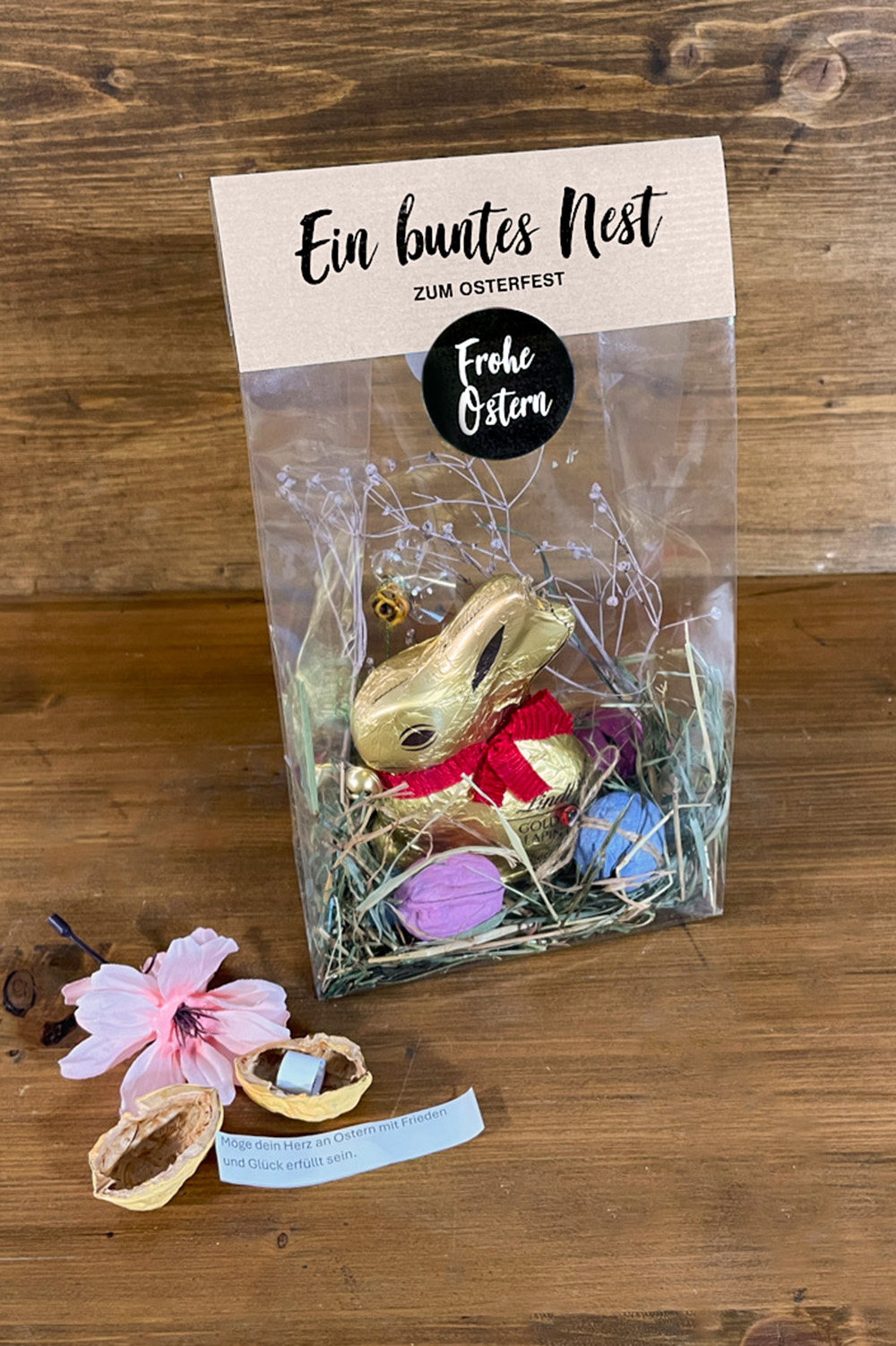 Ostern steht vor der Tür – Zeit, Freude zu verschenken! Unsere Ostersäckli mit Lindt Goldhase und Glücksnüssen mit schönen Sprüchen sind das perfekte Geschenk für Gross und Klein.
